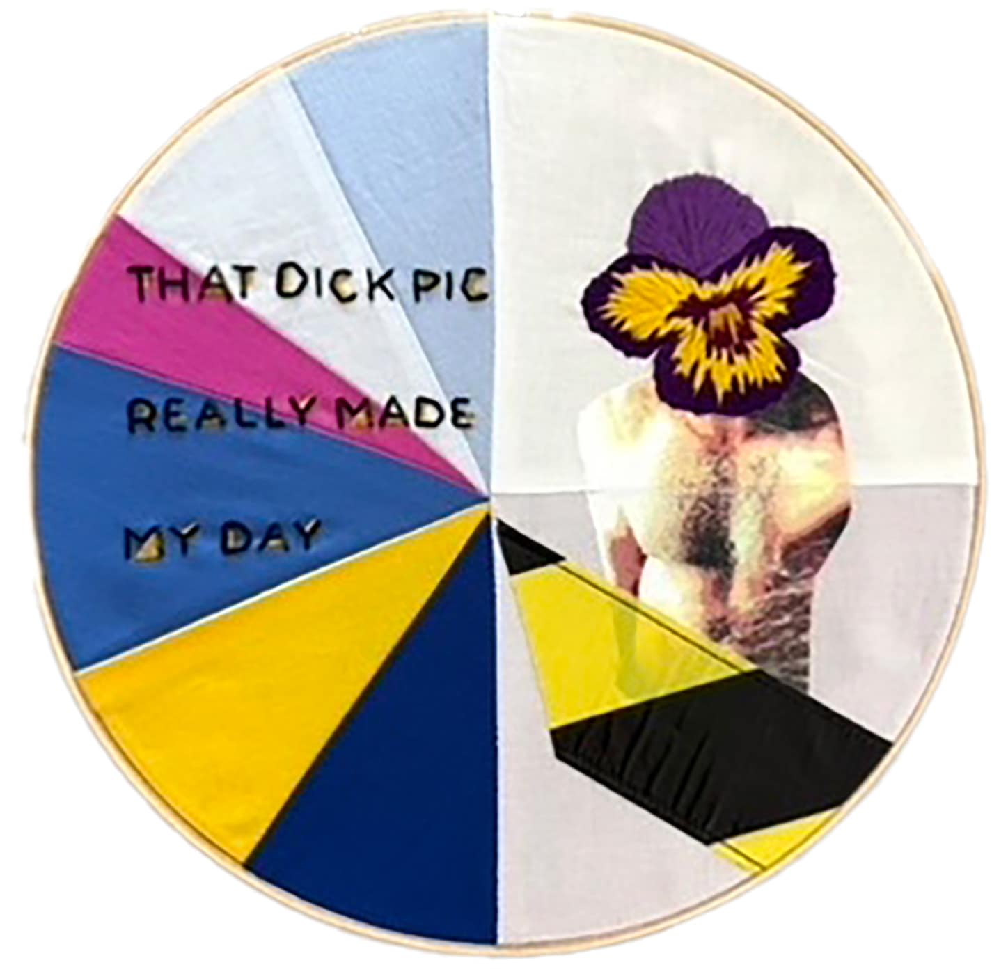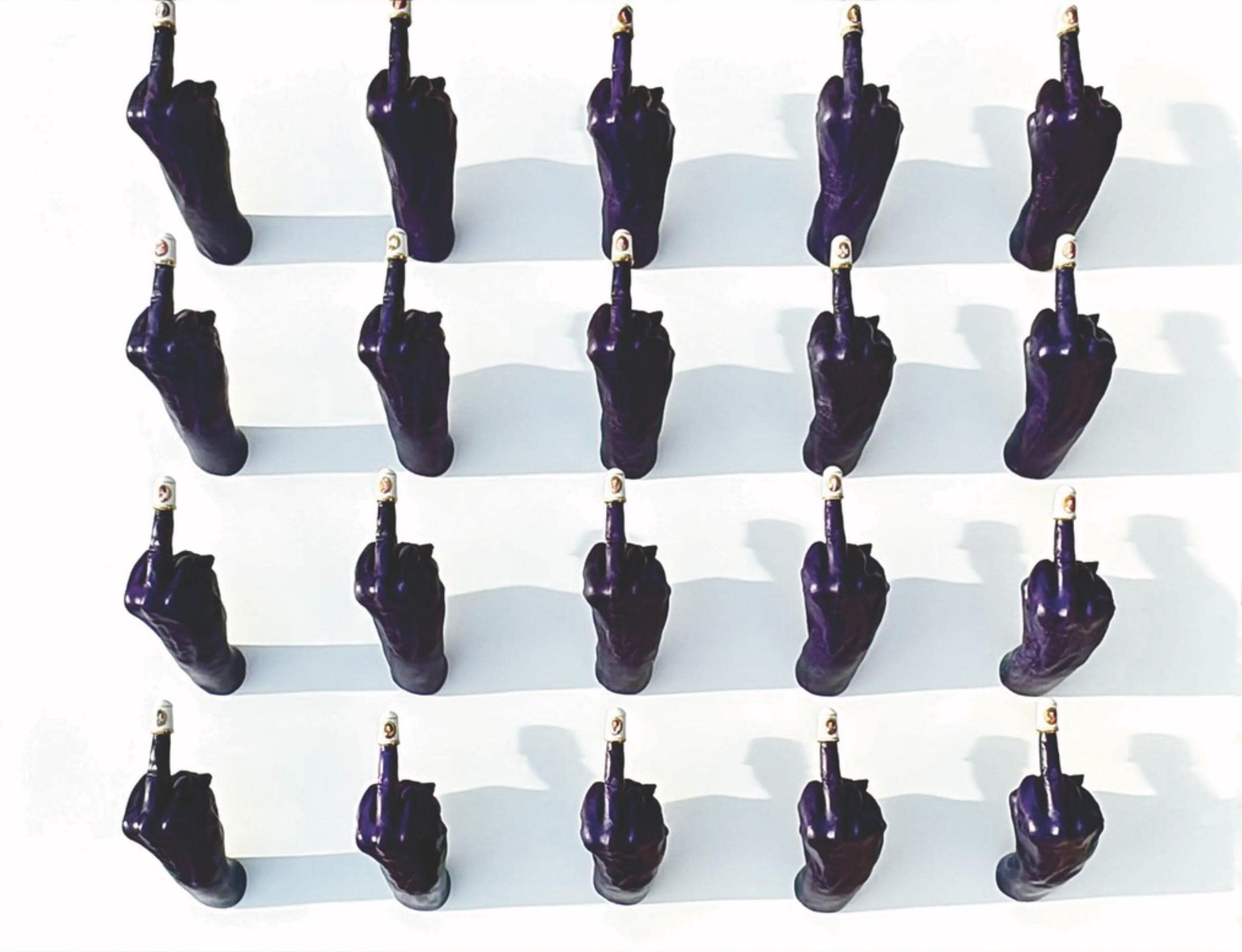 Description: A Woman’s Work is Never Done features 20 female hands-each giving the middle finger while wearing a commemorative thimble with the portrait of a U.S. First Lady. The purple color symbolizes royalty and power, reclaiming dignity in the face of historical dismissal. The thimbles-symbols of domestic labor-are to be worn on the middle finger.