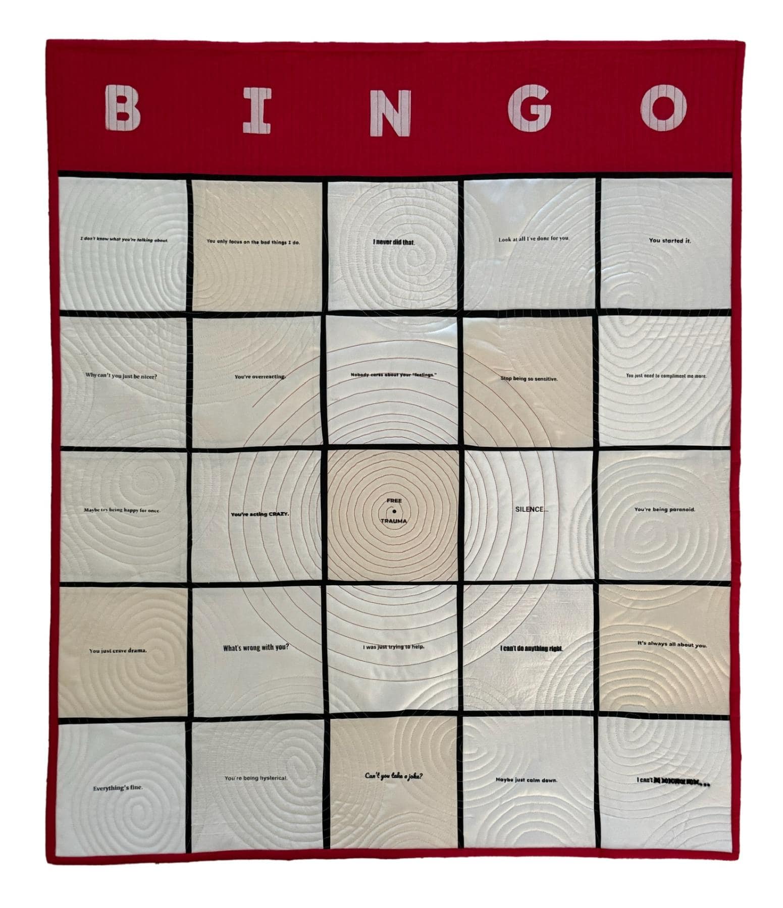 Description: Emotional Blackmail gathers 25 statements that wound; phrases that dismiss, project, and distort intimacy into something unsafe. This normalized language is printed on remnants of wedding dresses, meant to represent love and devotion. Through these fragments, we can reflect on how language can either protect or damage us; build safety or fracture trust.